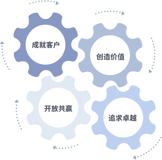 成就客户是一切决策的出发点,,,,创造价值是衡量所有工作的标准,,追求卓越是我们做事做人的态度,,,开放共赢是我们的格局也是最终的结果。。价值观的齿轮环环相扣,,,,推动着组织里的每个人不断向前。。。。