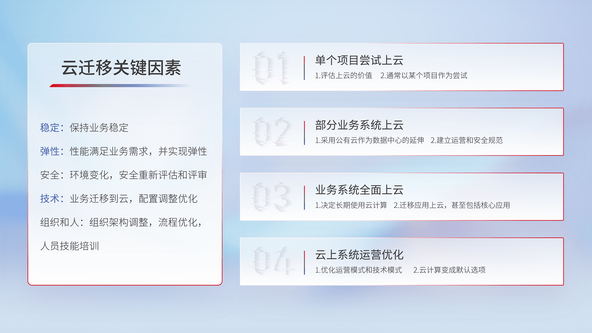 结合实际业务,,,从规划设计、、、、云平台选型、、、云原生改造、、、数据迁移、、、、集成交付,,,迁移全过程为客户识别最佳上云路径,,,,做好风险识别管理,,设计网络架构、、身份权限、、、、安全审计合规、、操作审计、、、日志审计、、、监控告警策略、、多站点容灾设计等,,对云上基础设施进行整体规划,,,,提升IT治理水平,,以满足弹性、、、、高可用、、、、高性能的需求。。。。