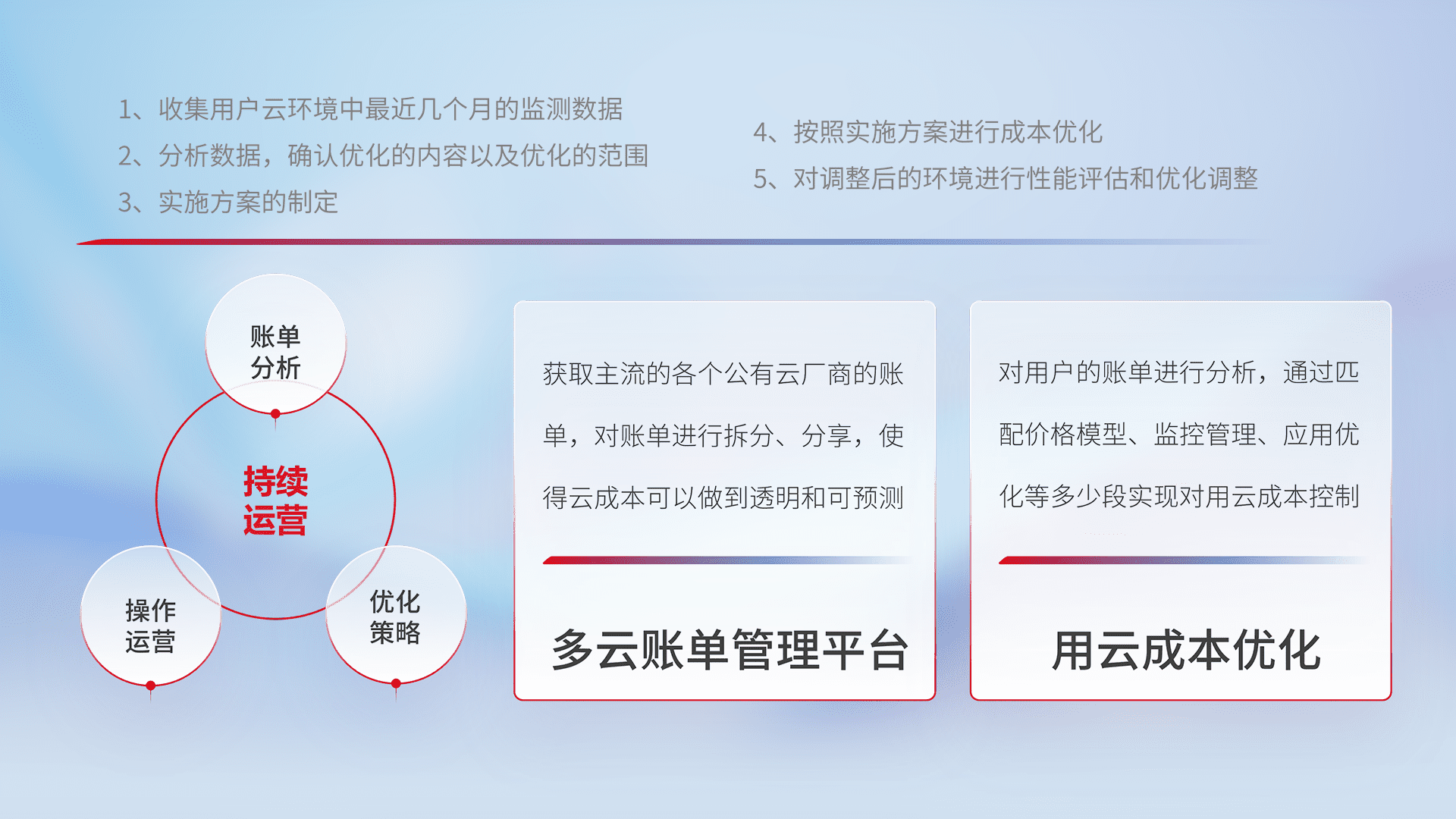 通过多云纳管,,,以统一的资源数据模型把客户的云资源进行抽象和封装,,进而实现对多云资源的统一操作,,,保障云资源管理的可靠性、、、稳定性与可用性。。。量身定制化运维内容,,配置、、、开发运维、、、补丁管理、、、备份、、、监控、、、、认证和访问管理、、、、审计和日常巡检等,,,保障在用云过程中的可靠度,,稳定度以及高可用率。。。